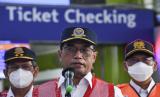 REPUBLIKA.CO.ID,JAKARTA -- Menteri Perhubungan Budi Karya Sumadi berbincang dengan calon penumpang kereta api saat meninjau kesiapan fasilitas stasiun usai gelar pasukan posko angkutan lebaran Stasiun Gambir di Jakarta, Jumat (22/4/2022).