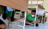 Sejumlah siswa berlindung di bawah meja saat simulasi gempa bumi dan tsunami di SMP Negeri 3 Kuta Selatan, Badung, Bali, Jumat (22/4/2022). Simulasi kebencanaan yang dilakukan untuk meningkatkan kesiapsiagaan masyarakat dalam mengurangi risiko bencana itu merupakan salah satu rangkaian kegiatan Global Platform for Disaster Risk Reduction (GPDRR) yang puncak pertemuannya akan dilaksanakan pada 23-28 Mei 2022 di Nusa Dua Bali. (FOTO : ANTARA/Fikri Yusuf)