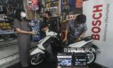 Product Specialist Bosch Automotive Aftermarket Indonesia Kristina Utami (tengah) memberikan penjelasan kepada pemilik sepeda motor di salah satu bengkel di Jakarta, Jumat (22/4/2022). Bosch Indonesia melalui Divisi Automotive Aftermarket menggagas kampanye Silaturahmi Aman dan Nyaman yang berlangsung dari 23-28 April 2022 dengan membagikan lebih dari 300 aki kepada para pemilik sepeda motor di Jabodetabek. Republika/Putra M. Akbar (FOTO : Republika/Putra M. Akbar)