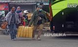 Sejumlah calon penumpang angkutan umum yang akan mudik menggotong barang bawaan mereka menuju bus di Terminal Bus Pakupatan Kota Serang, Banten, Jumat (22/4/2022). Sejumlah warga melakukan mudik lebih awal ke sejumlah kota tujuan di Jawa dan Sumatera untuk menghindari kemacetan dan penumpukkan penumpang saat puncak arus mudik yang diprediksi akan terjadi tanggal 28 April hingga 1 Mei mendatang. (FOTO : ANTARA/Asep Fathulrahman)
