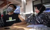 REPUBLIKA.CO.ID,PALEMBANG -- Prajurit Pangkalan TNI Angkatan Laut (Lanal) Palembang menyuntikkan vaksin COVID-19 dosis ketiga atau booster kepada pemudik di Stasiun Kertapati Palembang Sumatera Selatan, Sabtu (23/4/2022).