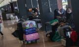 Seorang petugas membantu mendorong troli barang bawaan pemudik menuju area kedatangan bus Antar Kota Antar Provinsi (AKAP) di Terminal WA Gara, Palangka Raya, Kalimantan Tengah, Sabtu (23/4/2022). Sejumlah warga memilih mudik lebih awal ke sejumlah kota tujuan di daerah Kalimantan untuk menghindari harga tiket tinggi dan kepadatan penumpang saat puncak arus mudik mendatang. (FOTO : ANTARA/Makna Zaezar)