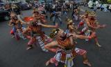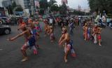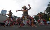 REPUBLIKA.CO.ID, Sejumlah peserta menari tarian Kiprah Cakil di Jalan Jenderal Sudirman, Salatiga, Jawa Tengah, Sabtu (23/4/2022). Aksi menari di tengah jalan yang dilakukan Komunitas Tari Salatiga Peduli itu bertujuan untuk memperkenalkan kesenian tari kepada masyarakat luas sekaligus memperingati Hari Tari Internasional yang jatuh pada 29 April 2022.