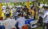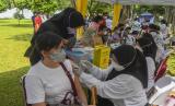 REPUBLIKA.CO.ID, JAKARTA -- Petugas kesehatan menyuntikkan vaksin COVID-19 kepada warga saat peringatan Pekan Imunisasi Dunia 2022 di Taman Lapangan Banteng, Jakarta, Sabtu (23/04/2022). Kementerian Kesehatan menggelar kegiatan Pekan Imunisasi Dunia 2022 dengan tema "Ayo! Sehatkan Keluarga Lewati Pandemi dengan Imunisasi Lengkap".