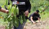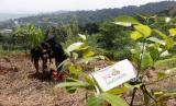 Pengelola Hutan Organik Megamendung saat melakukan penanaman 15.000 bibit pohon bersamaan dengan Hari Bumi Internasional, Bogor, Jawa Barat, Ahad (24/4/2022). BNI melanjutkan kerja sama dengan Hutan Organik Mega Mendung untuk perluasan lahan, pembentukan sungai, sekaligus penguatan kapasitas Kelompok Tani Hutan Organik Megamendung untuk membangun ekowisata. Foto: Tahta Aidilla/Republika (FOTO : Tahta Aidilla/Republika)
