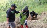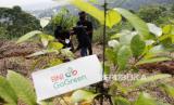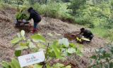 Pengelola Hutan Organik saat melakukan penanaman 15.000 bibit pohon bersamaan dengan Hari Bumi Internasional, Bogor, Jawa Barat, Ahad (24/4/2022). BNI melanjutkan kerja sama dengan Hutan Organik Mega Mendung untuk perluasan lahan, pembentukan sungai, sekaligus penguatan kapasitas Kelompok Tani Hutan Organik Megamendung untuk membangun ekowisata. (FOTO : Tahta Aidilla/Republika)