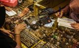 Pedagang melayani calon pembeli emas perhiasan di pusat pertokoan emas di kawasan Pasar Besar, Palangka Raya, Kalimantan Tengah, Ahad (24/4/2022). Menurut pedagang setempat penjualan emas perhiasan menjelang perayaan hari raya lebaran Idul Fitri tahun ini meningkat sebanyak 80 persen dibandingkan tahun lalu dan diperkirakan akan terus mengalami peningkatan mendekati lebaran mendatang. (FOTO : ANTARA/Makna Zaezar )