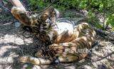 Kondisi bangkai harimau Sumatera (Panthera tigris sumatrae) yang ditemukan mati terkena jerat di kawasan hutan PT Aloer Timur Desa Sri Mulya, Kecamatan Peunaron, Kabupaten Aceh Timur, Aceh, Ahad, (24/04/2022). Sebanyak Tiga ekor harimau Sumatera (Panthera tigris sumatrae) yang terdiri dari satu ekor induk betina, satu ekor anak harimau jantan dan satu ekor belum diketahui jenis kelaminnya ditemukan mati diduga akibat terkena jerat babi. (FOTO : ANTARA/Weinko Andika)