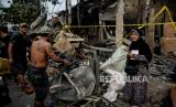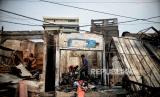 Warga mencari puing-puing bangunan di lokasi terdampak kebakaran di kawasan Pasar Gembrong, Jakarta, Senin (25/4/2022). Sebanyak 400 rumah dan pertokoan dikawasan tersebut terbakar pada Ahad (24/4) sekitar pukul 21.00 WIB yang diduga akibat korsleting listrik. Menurut Ikatan Pedagang Pasar Indonesia, kerugian akibat kebakaran di Pasar Gembrong tersebut ditaksir sekitar Rp 2 miliar. Republika/Thoudy Badai (FOTO : Republika/Thoudy Badai)