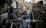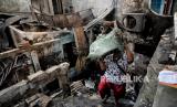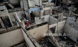 Warga mencari puing-puing bangunan di lokasi terdampak kebakaran di kawasan Pasar Gembrong, Jakarta, Senin (25/4/2022). Sebanyak 400 rumah dan pertokoan dikawasan tersebut terbakar pada Ahad (24/4) sekitar pukul 21.00 WIB yang diduga akibat korsleting listrik. Menurut Ikatan Pedagang Pasar Indonesia, kerugian akibat kebakaran di Pasar Gembrong tersebut ditaksir sekitar Rp 2 miliar. (FOTO : Republika/Thoudy Badai)