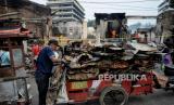 Warga membawa puing bangunan di lokasi terdampak kebakaran di kawasan Pasar Gembrong, Jakarta, Senin (25/4/2022). Sebanyak 400 rumah dan pertokoan dikawasan tersebut terbakar pada Ahad (24/4) sekitar pukul 21.00 WIB yang diduga akibat korsleting listrik. Menurut Ikatan Pedagang Pasar Indonesia, kerugian akibat kebakaran di Pasar Gembrong tersebut ditaksir sekitar Rp 2 miliar. (FOTO : Republika/Thoudy Badai)