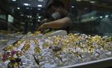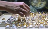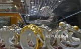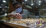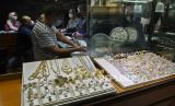 REPUBLIKA.CO.ID, JAKARTA -- Pedagang mengambil perhiasan yang dipilih calon pembeli di salah satu toko di sentra penjualan perhiasan emas Cikini, Jakarta, Senin (25/4/2022). Menurut sejumlah pedagang setempat, penjualan perhiasan emas di sentra tersebut masih lesu menjelang Idul Fitri akibat daya beli masyarakat belum pulih.