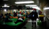 Pemudik motor beristirahat di dalam Kapal KM Dobonsolo tujuan Semarang dan Surabaya di Terminal Penumpang Tanjung Priok, Jakarta, Selasa (26/4/202). Pada pekan ke empat Ramadhan 1443 Hijriah, Pelabuhan Tanjung Priok mencatat jumlah pemudik pada 26 April 2022 sebanyak 512 orang dan 241 motor, Sementara prediksi puncak arus mudik di Terminal Penumpang Tanjung Priok terjadi pada Jumat (29/4). Republika/Thoudy Badai (FOTO : Republika/Thoudy Badai)