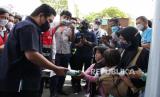 Menteri BUMN Erick Thohir (kiri) memberikan cinderamata kepada pemudik saat melepas kapal mudik gratis di Pelabuhan Tanjung Priok, Jakarta Utara, Selasa (26/4/2022). Mudik gratis sepeda motor tahun 2022 diinisiasi Kementerian Perhubungan dengan Kementerian BUMN. Tercatat Sebanyak 1.109 penumpang dan 388 sepeda motor mengunakan KM Dobonsolo. Foto; Tahta Aidilla/Republika. (FOTO : Tahta Aidilla/Republika)