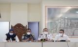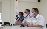 Kepala Otoritas Pelabuhan Tanjung Priok Wisnu Handoko (kedua kanan) memaparkan persiapan dan kesiapan terminal penumpang jelang arus puncak mudik 2022 di Kantor Pusat Pelabuhan Tanjung Priok, Selasa (26/4/2022). Berdasarkan data Kantor Otoritas Pelabuhan Tanjung Priok per Senin (25/4), tercatat sebanyak 2.104 penumpang naik turun, dengan rincian penumpang naik 149 orang dan penumpang turun 1.976 orang dan penumpang lanjutan 424 orang. Per Selasa (26/4) Panitia Mudik mencatat penumpang mudik gratis, 317 motor, penumpang 686 orang, dan penumpang umum 373 orang dengan tujuan ke Semarang dan Surabaya tersebut akan diberangkatkan pada pukul 13.00 WIB. Foto: Tahta Aidilla/Republika. (FOTO : Tahta Aidilla/Republika)