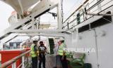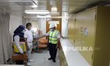 Kepala Otoritas Pelabuhan Tanjung Priok Wisnu Handoko (kanan) mengecek persiapan dan kesiapan ruang poliklinik di di KM Dobonsolo terminal penumpang di Pelabuhan Tanjung Priok, Selasa (26/4/2022). Berdasarkan data Kantor Otoritas Pelabuhan Tanjung Priok per Senin (25/4), tercatat sebanyak 2.104 penumpang naik turun, dengan rincian penumpang naik 149 orang dan penumpang turun 1.976 orang dan penumpang lanjutan 424 orang. Per Selasa (26/4) Panitia Mudik mencatat penumpang mudik gratis, 317 motor, penumpang 686 orang, dan penumpang umum 373 orang dengan tujuan ke Semarang dan Surabaya tersebut diberangkatkan pada pukul 13.00 WIB. Foto: Tahta Aidilla/Republika. (FOTO : Tahta Aidilla/Republika)