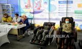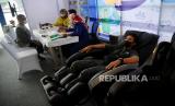Pemudik mencoba fasilitas pijat gratis di posko mudik BPJS Kesehatan di Terminal Pulo Gebang, Jakarta, Selasa (26/4/2022). BPJS Kesehatan mendirikan posko mudik saat arus mudik 2022 dibeberapa titik diantranya di Terminal Pulo Gebang, Rest Area Tol Cikampek KM 57, Rest Area Tol Unggaran KM 429, Terminal Purabaya Sidoarjo dan Pelabuhan Soekarno Hatta Makassar dengan fasilitas tes kesehatan gratis, layanan pijat. (FOTO : Republika/Thoudy Badai)