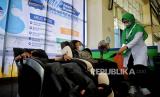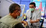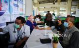 Pemudik memeriksa kesehatannya di posko mudik BPJS Kesehatan di Terminal Pulo Gebang, Jakarta, Selasa (26/4/2022). BPJS Kesehatan mendirikan posko mudik saat arus mudik 2022 dibeberapa titik diantranya di Terminal Pulo Gebang, Rest Area Tol Cikampek KM 57, Rest Area Tol Unggaran KM 429, Terminal Purabaya Sidoarjo dan Pelabuhan Soekarno Hatta Makassar dengan fasilitas tes kesehatan gratis, layanan pijat. Republika/Thoudy Badai (FOTO : Republika/Thoudy Badai)
