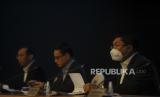 Direktur Utama Bank Mandiri Darmawan Junaidi (kanan) bersama Direktur Keuangan dan Strategi Bank Mandiri Sigit Prastowo (kiri) Direktur Manajemen Risiko Bank Mandiri Ahmad Siddik Badruddin saat menyampaikan paparan kinerja triwulanan perseroan di Jakarta, Rabu (27/4/2022). Pada Triwulan I-2022, Bank Mandiri berhasil mencetak laba bersih konsolidasi sebesar Rp 10 triliun atau tumbuh 70% yoy, yang ditopang oleh pertumbuhan kredit secara konsolidasi sebesar 8,93% (yoy) menjadi Rp 1.072,9 triliun. Melalui strategi pengembangan core business ke arah digital melalui Livin (FOTO : Republika/Putra M. Akbar)