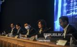 Direktur Utama Bank Mandiri Darmawan Junaidi (tengah) bersama Direktur Keuangan dan Strategi Bank Mandiri Sigit Prastowo, Direktur Manajemen Risiko Bank Mandiri Ahmad Siddik Badruddin, Wakil Direktur Utama Bank Mandiri Alexandra Askandar, Direktur Treasury & International Banking Bank Mandiri Panji Irawan (dari kiri ke kanan) saat menyampaikan paparan kinerja triwulanan perseroan di Jakarta, Rabu (27/4/2022). Pada Triwulan I-2022, Bank Mandiri berhasil mencetak laba bersih konsolidasi sebesar Rp 10 triliun atau tumbuh 70% yoy, yang ditopang oleh pertumbuhan kredit secara konsolidasi sebesar 8,93% (yoy) menjadi Rp 1.072,9 triliun. Melalui strategi pengembangan core business ke arah digital melalui Livin (FOTO : Republika/Putra M. Akbar)