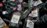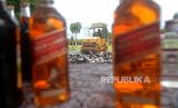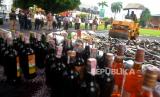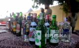 Ribuan botol minuman keras siap dimusnahkan di Halaman Mapolda DIY, Yogyakarta, Rabu (27/4/2022). Sebanyak 4.800an botol minuman keras berbagai merk dan 135 knalpot brong hasil sitaan operasi cipta kondisi dimusnahkan oleh Polda DIY. (FOTO : Wihdan Hidayat / Republika)