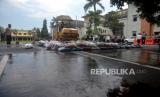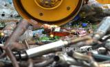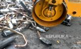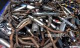 Ratusan knalpot Brong dimusnahkan dan knalpot brong menggunakan alat berat di Halaman Mapolda DIY, Yogyakarta, Rabu (27/4/2022). Sebanyak 4.800an botol minuman keras berbagai merk dan 135 knalpot brong hasil sitaan operasi cipta kondisi dimusnahkan oleh Polda DIY. (FOTO : Wihdan Hidayat / Republika)