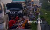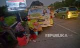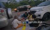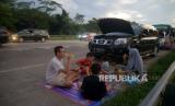 Sejumlah pemudik berbuka puasa sambil beristirahat di KM 102 ruas tol Cikopo-Palimanan, Subang, Jawa Barat, Kamis (28/4/2022). Padatnya sejumlah rest area di sepanjang jalan tol Trans Jawa membuat pemudik memanfaatkan bahu jalan untuk berbuka puasa dan istirahat sejenak.Prayogi/Republika (FOTO : Prayogi/Republika.)