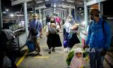 Pemudik bersiap menaiki kapal di Pelabuhan Merak, Banten, Jumat (29/4/2022) dini hari. Pada H-3 Hari Raya Idul Fitri 1443 Hijriah, jumlah pemudik yang meninggalkan pulau Jawa menuju Sumatera melalui Pelabuhan Merak, Banten mengalami peningkatan yang signifikan, sementara berdasarkan data dari PT ASDP Indonesia Ferry (Persero) jumlah penumpang pada Kamis (28/4/2022) sebanyak 306.898 orang dan 72.540 unit kendaraan. Republika/Thoudy Badai (FOTO : Republika/Thoudy Badai)