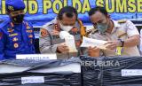 Kapolda Sumatera Selatan Irjen Pol Toni Harmanto (tengah) didampingi Pelaksana Koordinator Pengawasan Karantina Ikan Palembang Erick Harianto (kedua kanan), Direktur Polair Polda Sumatera Selatan Kombes Pol Yohanes Sismadi Widodo (kedua kiri) dan pejabat lainnya memberikan keterangan kepada wartawan saat konferensi pers di Ditpolairud Polda Sumatera Selatan, Palembang, Jumat (29/4/2022). Ditpolairud Polda Sumatera Selatan berhasil menggagalkan rencana penyelundupan 517.000 ekor benih lobster senilai Rp52 miliar ke Singapura dan Vietnam serta mengamankan tiga orang tersangka.  (FOTO : ANTARA/Leika A Ramadhan )