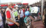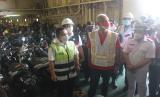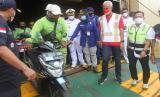 Direktur PT PELNI Yahya Kuncoro m (rompi hijau) yang ikut berlayar mendampingi Gubernur Jawa Tengah Ganjar Pranowo saat menyambut kedatangan kapal KM Ciremai di Pelabuhan Tanjung Mas Semarang, Jawa Tengah, Sabtu (30/4).Sebanyak 1.481 peserta mudik dan 649 unit sepeda motor turun dari KM Ciremai di Pelabuhan Tanjung Emas, Semarang,Para peserta mudik gratis sepeda motor ini diberangkatkan dari Tanjung Priok, Jakarta sehari sebelumnya. (FOTO : dok. PELNI )