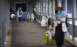 Sejumlah calon penumpang tanpa kendaraan berjalan menuju ke kapal penyeberangan di Pelabuhan Merak, Banten, Ahad (1/5/2022). Arus mudik pada H-1 lebaran di Pelabuhan Merak terpantau lengang dan tidak ada penumpukan kendaraan maupun penumpang. (FOTO : ANTARA/Akbar Nugroho Gumay)