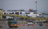 Sejumlah kendaraan bersiap menaiki kapal penyeberangan di Pelabuhan Merak, Banten, Ahad (1/5/2022). Arus mudik pada H-1 lebaran di Pelabuhan Merak terpantau lengang dan tidak ada penumpukan kendaraan maupun penumpang. (FOTO : ANTARA/Akbar Nugroho Gumay)