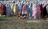 Umat Muslim mengikuti Shalat Iedul Fitri 1443H di Gumuk Pasir, Parangkusumo, Bantul, Yogyakarta, Senin (2/5/2022). Sekitar 5 ribu umat muslim ikut menunaikan Shalat Ied di Gumuk Pasir. Shalat Ied ini kembali diadakan usai absen selama dua tahun imbas pandemi Covid-19. (FOTO : Wihdan Hidayat / Republika)