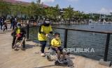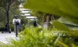 Sejumlah pengunjung mengendarai skuter listrik di kawasan Kiara Artha Park, Kota Bandung, Kamis (5/5/2022). Kawasan wisata yang menyuguhkan atraksi air mancur, trek lari dan sepeda tersebut ramai dikunjungi wisatawan dari dalam maupun luar Kota Bandung untuk mengisi waktu libur Lebaran 2022. Foto: Republika/Abdan Syakura (FOTO : REPUBLIKA/ABDAN SYAKURA)