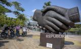 Sejumlah pengunjung beraktivitas di kawasan Kiara Artha Park, Kota Bandung, Kamis (5/5/2022). Kawasan wisata yang menyuguhkan atraksi air mancur, trek lari dan sepeda tersebut ramai dikunjungi wisatawan dari dalam maupun luar Kota Bandung untuk mengisi waktu libur Lebaran 2022. Foto: Republika/Abdan Syakura (FOTO : REPUBLIKA/ABDAN SYAKURA)