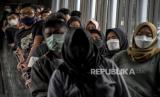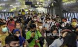 Sejumlah calon penumpang antre untuk memasuki area Stasiun Bandung, Kota Bandung, Kamis (5/5/2022). PT KAI Daop 2 Bandung mencatat sekitar 30 ribu penumpang kereta api turun di area Daop 2 Bandung pada puncak arus balik lebaran 2022 di hari Rabu (4/5) dan Kamis (5/5). Foto: Republika/Abdan Syakura (FOTO : REPUBLIKA/ABDAN SYAKURA)