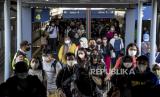 Sejumlah penumpang turun dari kereta api (KA) Lodaya setibanya di Stasiun Bandung, Kota Bandung, Kamis (5/5/2022). PT KAI Daop 2 Bandung mencatat sekitar 30 ribu penumpang kereta api turun di area Daop 2 Bandung pada puncak arus balik lebaran 2022 di hari Rabu (4/5) dan Kamis (5/5). Foto: Republika/Abdan Syakura (FOTO : REPUBLIKA/ABDAN SYAKURA)