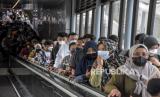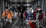 Sejumlah penumpang kereta api (KA) Argo Parahyangan berada di Sky Bridge (jembatan layang) setibanya di Stasiun Bandung, Kota Bandung, Kamis (5/5/2022). PT KAI Daop 2 Bandung mencatat sekitar 30 ribu penumpang kereta api turun di area Daop 2 Bandung pada puncak arus balik lebaran 2022 di hari Rabu (4/5) dan Kamis (5/5). Foto: Republika/Abdan Syakura (FOTO : REPUBLIKA/ABDAN SYAKURA)