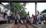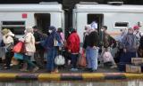 Penumpang turun dari kereta api di Stasiun Gubeng Surabaya, Jawa Timur, Jumat (6/5/2022). Secara keseluruhan di tiga stasiun yaitu Stasiun Gubeng, Pasarturi dan Malang, tercatat sebanyak 20.391 penumpang tiba dan 13.634 penumpang berangkat pada H+3 Lebaran 2022 dan jumlah tersebut diprediksi akan meningkat di hari-hari berikutnya. (FOTO : ANTARA/Didik Suhartono)