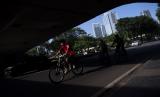 Pesepeda melintas di bawah Jembatan Semanggi, Jakarta, Ahad (8/5/2022). Warga memanfaatkan hari Minggu setelah libur cuti Lebaran untuk berolahraga. (FOTO : ANTARA/Sigid Kurniawan)