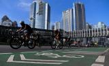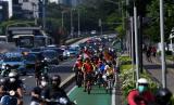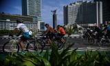 Pesepeda melintas di Jalan Jenderal Sudirman Jakarta, Ahad (8/5/2022). Warga memanfaatkan hari Minggu setelah libur cuti Lebaran untuk berolahraga. (FOTO : ANTARA/Sigid Kurniawan)