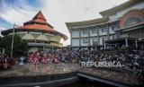 Sejumlah pengunjung menyaksikan pertunjukan Tari Topeng di Perkampungan Budaya Betawi, Setu Babakan, Jakarta, Ahad (8/5/2022). Perkampungan Budaya Betawi Setu Babakan menggelar pagelaran kesenian Betawi untuk menghibur para pengunjung saat libur Lebaran 1443 Hijriah. (FOTO : Republika/Putra M. Akbar)