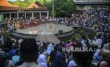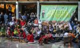 Sejumlah pengunjung menyaksikan pertunjukan kesenian di Perkampungan Budaya Betawi, Setu Babakan, Jakarta, Ahad (8/5/2022). Perkampungan Budaya Betawi Setu Babakan menggelar pagelaran kesenian Betawi untuk menghibur para pengunjung saat libur Lebaran 1443 Hijriah. (FOTO : Republika/Putra M. Akbar)