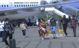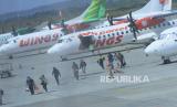 REPUBLIKA.CO.ID, KUPANG -- Sejumlah pemudik turun dari pesawat saat tiba di Bandara El Tari Kupang, NTT, Ahad (8/5/2022). Posko angkutan udara Idul Fitri 1443 H bandara EL Tari Kupang memprediksi puncak arus balik di bandara itu terjadi pada Ahad (8/5). Jumlah pemudik diperkirakan naik 26 persen dibandingkan dengan hari sebelumnya yang mencapai 3.949 pemudik melalui bandara itu.