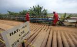 REPUBLIKA.CO.ID, INDRAMAYU -- Pekerja membersihkan sisa tumpahan minyak akibat kebocoran pipa milik PT Pertamina EP Zona 7 Region Jawa di desa Cikedung, Indramayu, Jawa Barat, Senin (9/5/2022). Kebocoran pipa tersebut menyebabkan tumpahan minyak mentah yang mencemari aliran sungai Cidadap sedangkan penyebab peristiwa itu masih dalam penyelidikan.
