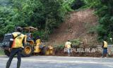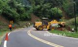 Petugas Dinas Bina Marga dan Penataan Ruang (DBMPR) Jawa Barat bersama Badan Nasional Penanggulangan Bencana Daerah (BPBD) membereskan bekas longsoran tebing yang terjadi di awal Lebaran lalu di Jalan Raya Subang-Bandung, Kecamatan Ciater, Kabupaten Subang, Selasa (10/5). Tumpukan sisa material longsor dibersihkan dari bahu jalan dan drainase yang tertutup longsor. Dengan masih tingginya intensitas hujan saat ini, para pengguna jalan yang melewati kawasan itu dihimbau waspada, mengingat ada sejumlah titik longsor di sepanjang tebing. (FOTO : Edi Yusuf/Republika)