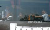 Orang tua wali santri melepas keberangkatan bus menuju Pondok Pesantren Modern Gontor di Halaman Parkir Bandara Adisucipto, Yogyakarta, Rabu (11/5/2022). Sebanyak 200an santri dari Yogyakarta kembali menuju Pondok Pesantren Modern Gontor secara bersama-sama. Orang tua wali santri juga ikut mengantarkan para santri hingga bus berangkat. (FOTO : Wihdan Hidayat / Republika)