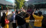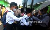 Santri menggunakan bus berangkat menuju Pondok Pesantren Modern Gontor di Halaman Parkir Bandara Adisucipto, Yogyakarta, Rabu (11/5/2022). Sebanyak 200an santri dari Yogyakarta kembali menuju Pondok Pesantren Modern Gontor secara bersama-sama. Orang tua wali santri juga ikut mengantarkan para santri hingga bus berangkat. (FOTO : Wihdan Hidayat / Republika)