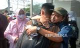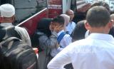 Orang tua wali mengantarkan santri kembali menuju Pondok Pesantren Modern Gontor di Halaman Parkir Bandara Adisucipto, Yogyakarta, Rabu (11/5/2022). Sebanyak 200an santri dari Yogyakarta kembali menuju Pondok Pesantren Modern Gontor secara bersama-sama. Orang tua wali santri juga ikut mengantarkan para santri hingga bus berangkat. (FOTO : Wihdan Hidayat / Republika)