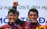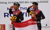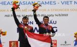 REPUBLIKA.CO.ID,HAI PHONG -- Pedayung Ardi Risedi (kanan) dan Kakan Rusmana berselebrasi usai pengalungan medali nomor lightweight man’s double scull cabana saying SEA Games 2021 di Hai Phong, Vietnam, Rabu (11/5/2022).